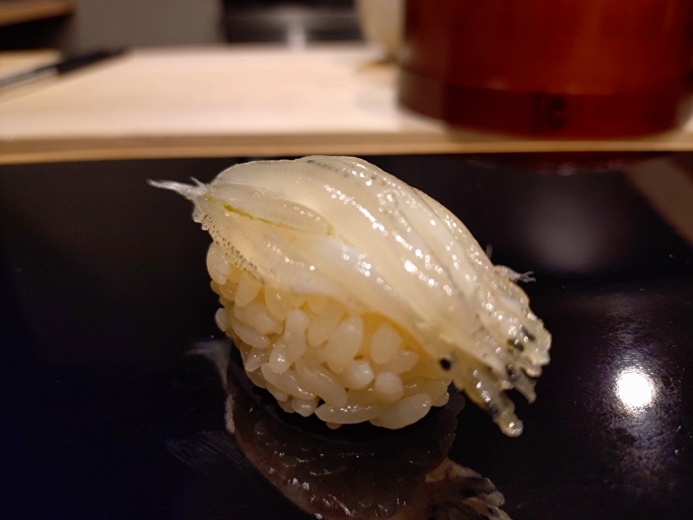 【鮨黒舟】では、この旬の白魚を厳選して仕入れ、軽く昆布〆に仕立てて余分な水分を抜き、身にじっくりと旨味をのせたうえで握りにして提供しています。白魚が持つ清らかな味わいと、シャリとのバランスを丁寧に調整し、ひと口ごとに春の訪れを感じていただけるように仕上げています。